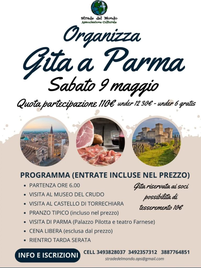 L’Aps Strade del Mondo organizza per i propri soci, una Gita a Parma nella giornata di Sabato 9 maggio. ![]()